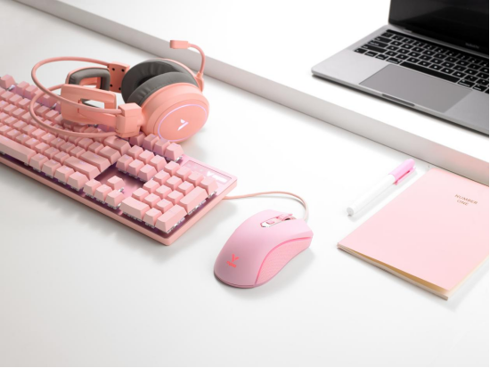 配套设备,同频共振,一嗨到底;搭配雷柏 V500PRO冰淇淋粉背光游戏机械键盘,VH610清莹粉虚拟7.1声道游戏耳机;当桌面场景被粉色占据时,视觉神经迎接挑战。这场桌面场景的团战即将来临。你准备好了吗?