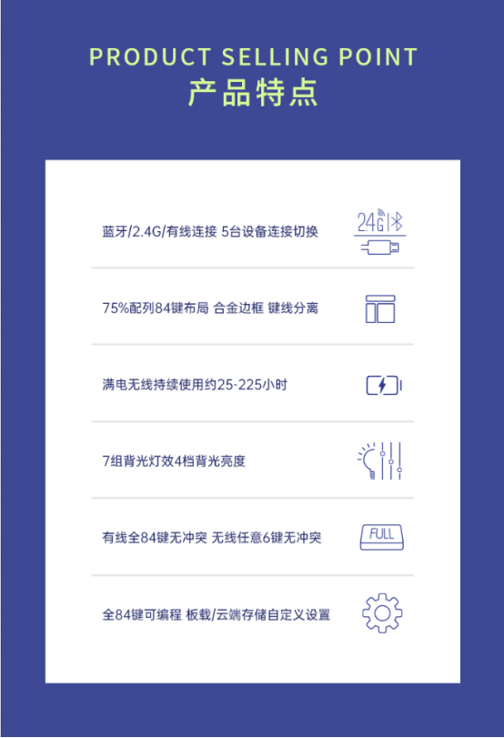 以技术研发为核心,以市场需求为指导,凭借强大的研发实力,自主研发定制了雷柏轴体、雷柏微动、游戏芯片等核心产品零部件。Qi无线充电、OLED显示屏、防水防尘、板载内存、云存储等个性化功能,具有出色的电子竞技性能,解决了玩家需求的痛点。V+无线游戏技术提升和优化耐力、低延迟、抗干扰和使用距离,以全新的战斗态度探索电子竞技的未来。