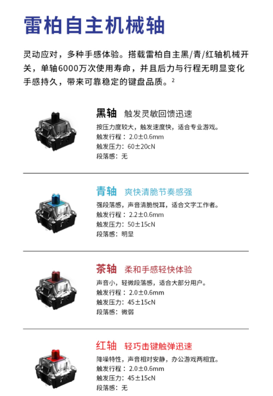 经过几代人的产品更新,雷柏自主机械轴已经成为国内高品质轴的代表。黑、绿、茶、红四个经典轴体的特点不用多说,让你喜欢;使用寿命6000万次,确保持久感;镭雕技术键帽,字符清晰耐磨,带你体验最原始的机械轴感。