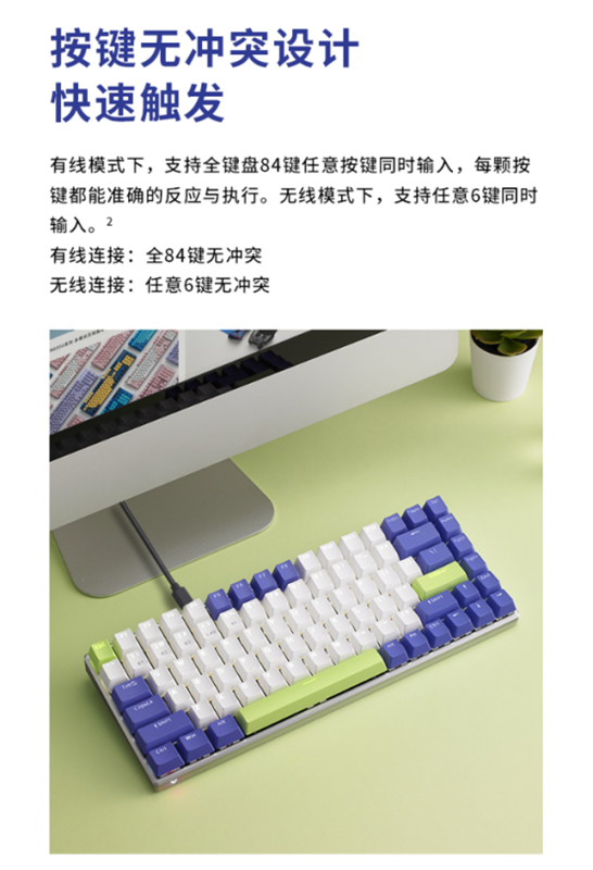 雷柏 V700-8A键盘可以在有线模式下实现全键无冲突。在蓝牙和2.4G模式下,支持同时输入任意6个键。快速触发,总是比别人快一步,稳操胜券。