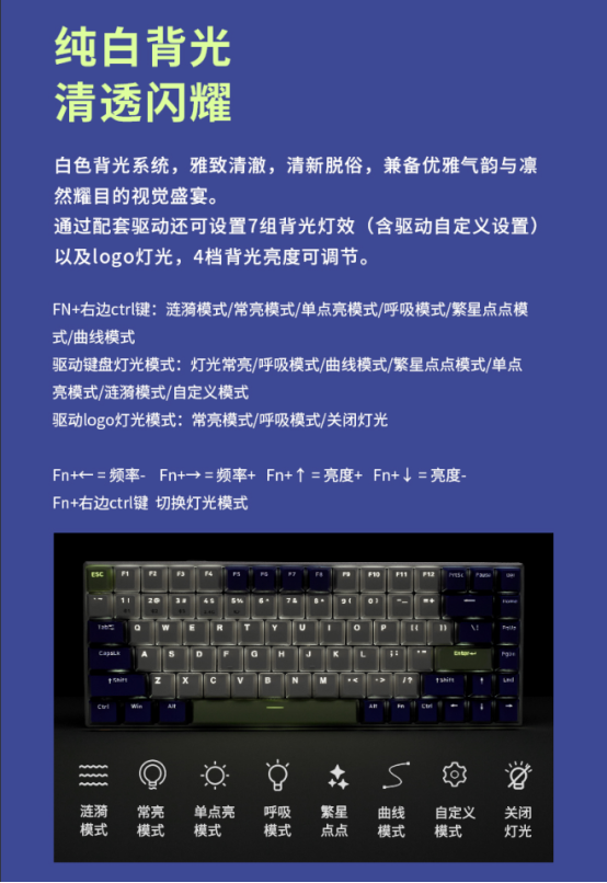 雷柏 V700-8A键盘采用纯白色背光系统,支持7种背光模式和4档亮度调节。通过驱动,还可以自定义设置和标志灯光,既有优雅的魅力,又有耀眼的视觉盛宴。