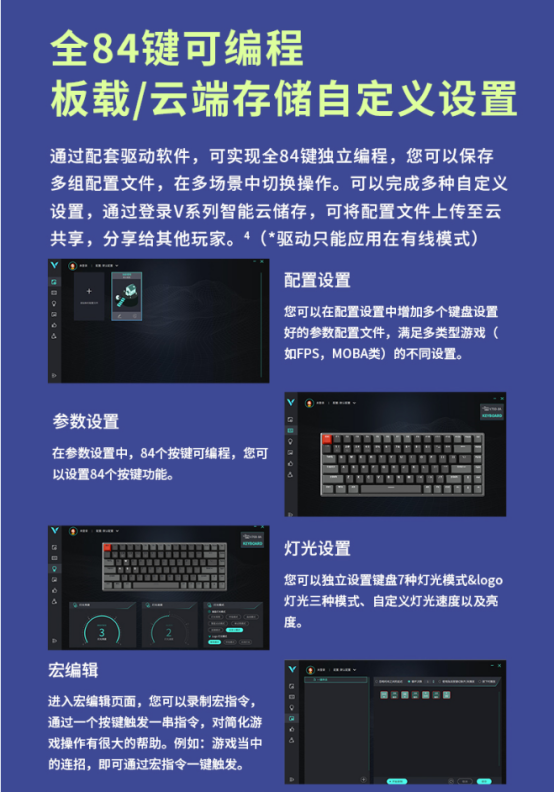 通过匹配雷柏 V700-8A键盘的驱动软件,您可以实现84键的独立编程。您可以保存多组配置文件并在多个场景中切换操作。您可以通过登录V系列智能云存储来完成各种自定义设置,并将配置文件上传到云共享并与其他玩家共享。