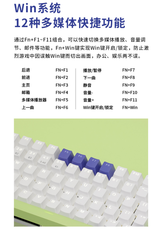 在Win系统中,雷柏 V700-8A键盘有12个多媒体快捷键,便于快速切换邮件、浏览器、多媒体播放等操作。