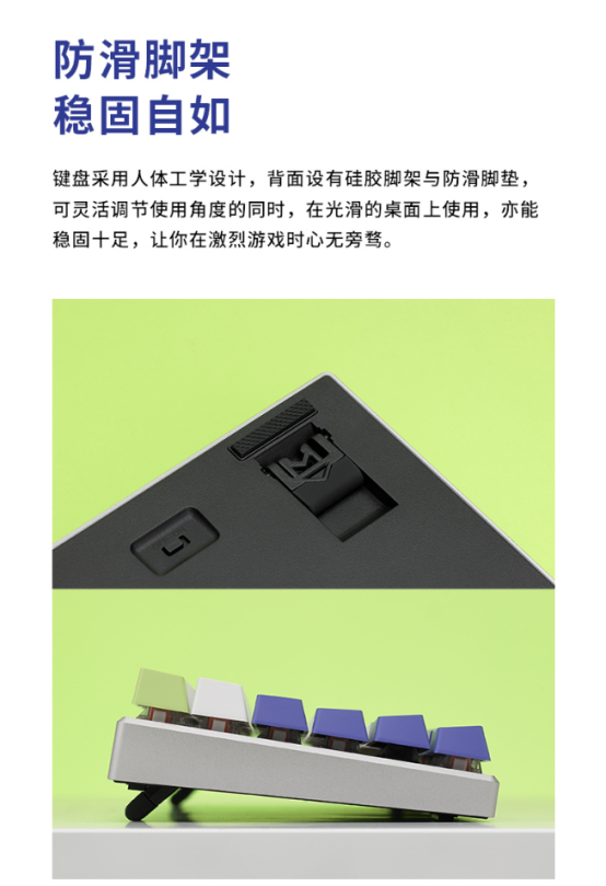 雷柏 V700-8A键盘采用符合人体工程学的设计,背面有硅胶三脚架和防滑脚垫,可以灵活调整使用角度,在光滑的桌面上使用,也可以稳定,让你在激烈的游戏中。