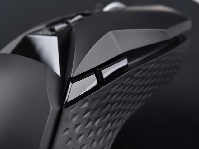 鼠标的DPI键采用电镀工艺的ABS材质,触感光滑,可以为鼠标调节合适的分辨率。此外,鼠标左右两侧各有两个侧键,侧键材质与DPI键相同。按钮手感坚韧,回弹整齐,没有任何空键程。这些侧键的默认功能是前进/后退,个性化指令可以通过驱动定制。完全对称的设计可以让左右手使用的用户获得同样的体验,适用范围还是很广的。
