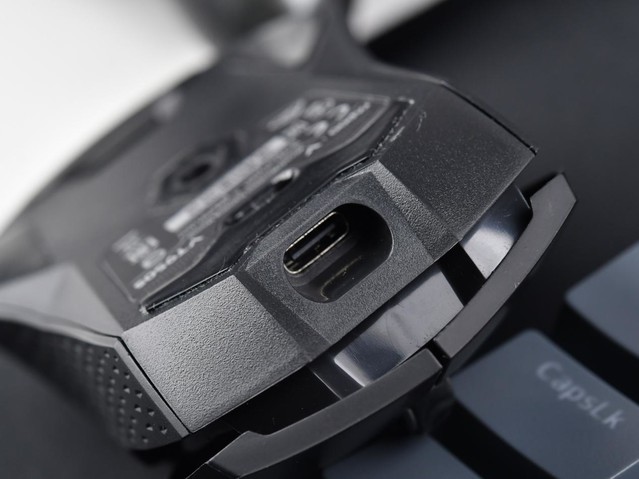 鼠标的侧裙由橡胶制成,前端有一个USBType-C端口,可以连接USB电缆充电。USB电缆两端设计有防拉设计,采用镀金插头,可保证使用寿命。