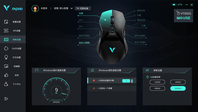 我们也可以通过驱动设置来调节鼠标的照明循环模式,但是可调节的模式只有呼吸灯和光谱循环,还是比较少的。VT950S照明区域只有尾部的双色注塑LOGO,在酷炫程度上还是有点差。