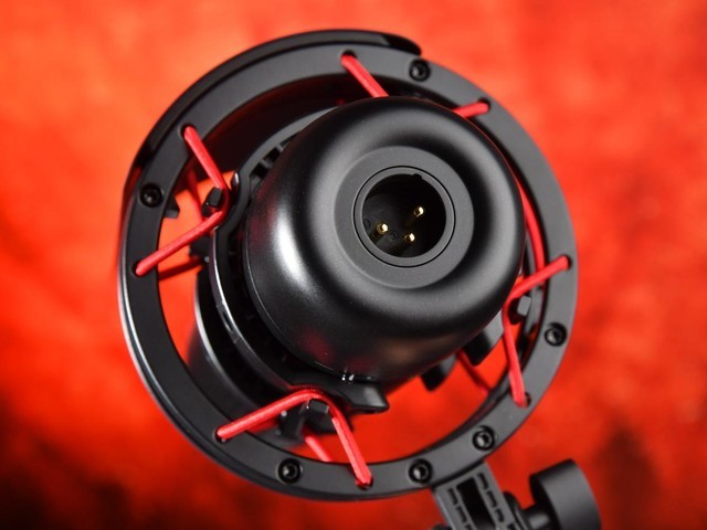 麦克风底部提供专业级别的XLR接口,HyperX ProCast声岚专业麦克风支持最大的48V幻象电源,并通过XLR线连接到专业设备上,或前置放大器,确保信号传输的高保真、高质量。HyperX ProCast专业麦克风在附件中提供的支架适配器,我们可以将麦克风拆开并固定在通用麦克风立杆支架上,使麦克风适应更多不同的场景。实际使用时,我们可以让这款麦克风进行专业的主播收音,或者,或者是参与工作室的专业力。