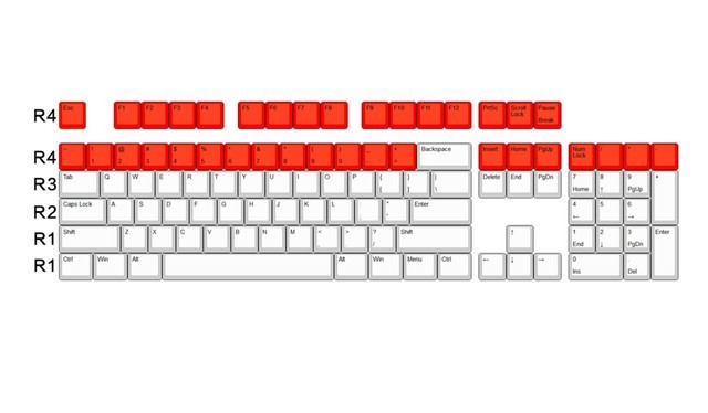 从键盘的上方数到下方总共会有6列,倾斜角度由上而下通常为R4、R4、R3、R2、R1、R1,将有些键帽翻过来看就会看到这些注记。至于还有一种更高的R5高度,这在目前键盘中算是极少见。另外,有些玩家对于键盘倾斜高度的说法是反过来叙述,由上而下变成R1、R1、R2、R3、R4、R4,虽然数字不同,但代表的意义并无不同。