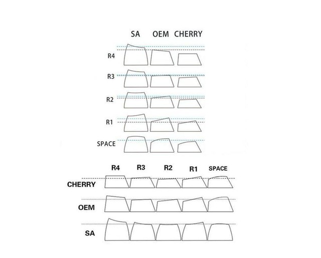 球帽SA和DSA高度比较容易分辨SA高度从侧面看没有明显的人体工程学曲线;DSA则有符合人体工程学的曲线。总得来说,除了SA和DSA在使用上有明显区别,其余高度在成套使用时并不会有明显区别。
