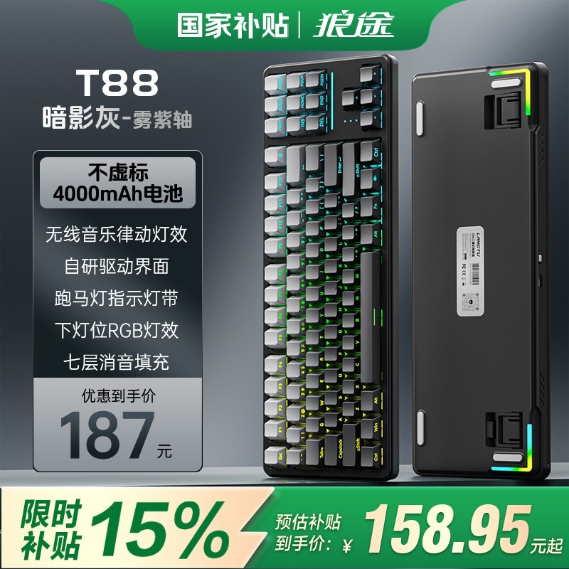 狼途 T88键盘在天猫精选的原价为179元,活动售价287元,现在参与立减100元,还有补贴15%起减28.05元的优惠活动。如果下单1件,最终实付低至145.92元,就能把这款既适合办公又能畅玩电竞游戏的客制化三模键盘带回家。