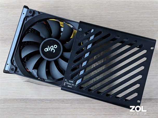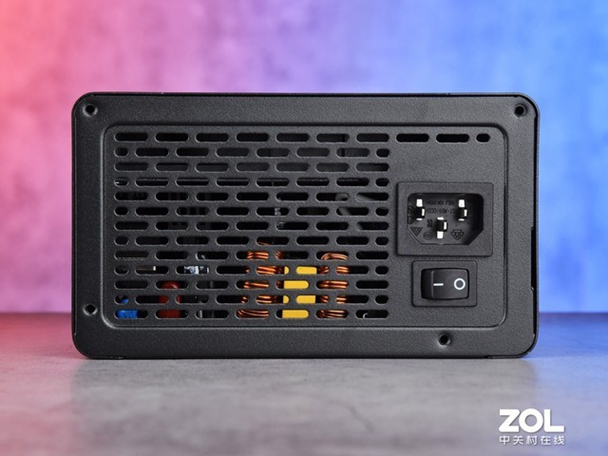 爱国者 ES650电源在外观上采用了创新的设计风格,尤其是风扇位的镂空设计让人眼前一亮,可以说是非常具有设计风格,主要配色则和包装一样采用了黑色和暗金的搭配,整体的质感也是很到位的。