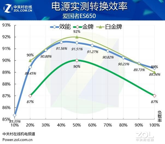 爱国者 ES650电源的额定功率为650W,可以为单卡旗舰平台提供用电支持,电源经过80 PLUS金牌认证,在实际测试中表现良好,各项转换效率可以达到金牌效能,满载转换效率可以达到白金效能。电源的待机功耗只有0.1W,整体的节能效果也很好。