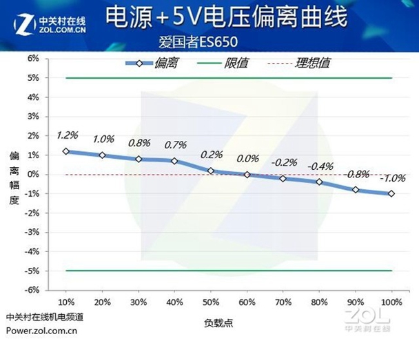 在电压偏离测试中,爱国者 ES650电源达到出色水平,各路输出电压偏离全部控制在2%的幅度内,属于说明各路的电压输出非常稳定。