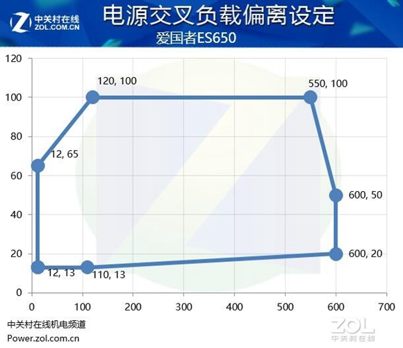 交叉负载能够将各路输出拉到极值进行测试,也就更能体现出每一路的偏离状况,爱国者 ES650电源的交叉负载同样全部控制在了3%的偏离之内,属于优秀表现。