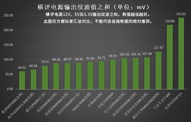 最后一个对比的项目是输出纹波,也就是电源输出电流的纯净度,这个数值同样是越低越好。电源标准对纹波的限值是12V纹波120mV,5V和3.3V的纹波50mV。