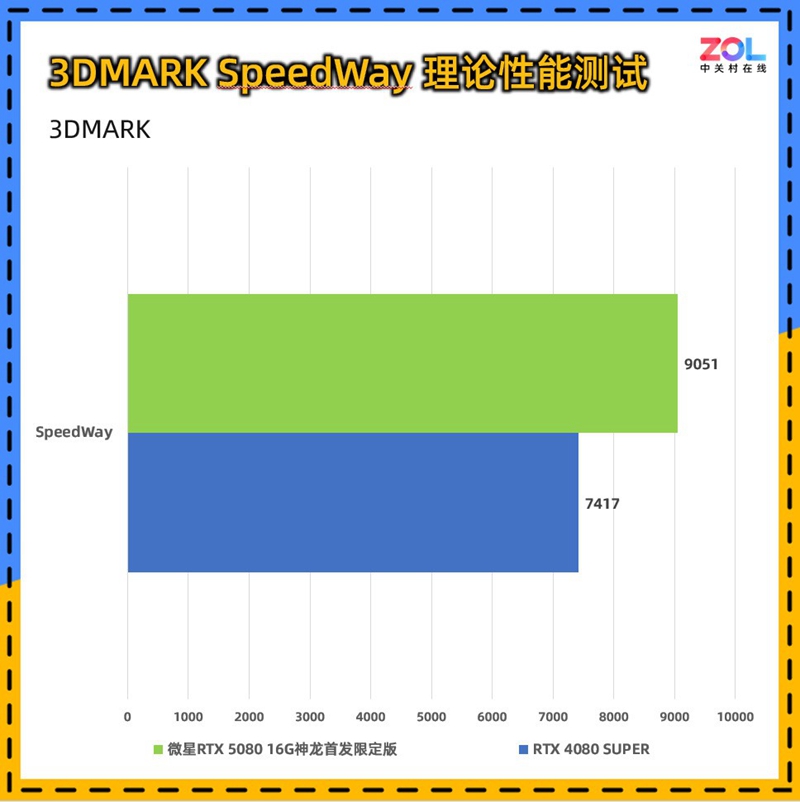 SpeedWay这项测试结合了实时光线追踪和传统渲染技术来测量显卡性能。场景含有光线追踪反射、实时全局光照、网格着色器、体积照明、粒子和后处理效果。所以SW的测试基本可以看做次世代3A游戏基准。微星 RTX5080 16G神龙首发限定版提升约为22%。