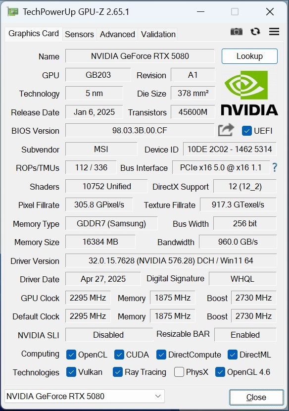 从GPU-Z读取到的信息来看,微星RTX5080 16G神龙首发限定版显卡拥有10752个CUDA核心,16GB GDDR7显存,总线带宽 256bit,带宽速率960GB/s,像素填充率305.8GPixel/s,纹理填充率为902.2GTexel/s,光栅单元和纹理单元为112/336,核心频率2295MHz,显存频率为1875MHz,Boost频率为2730MHz。