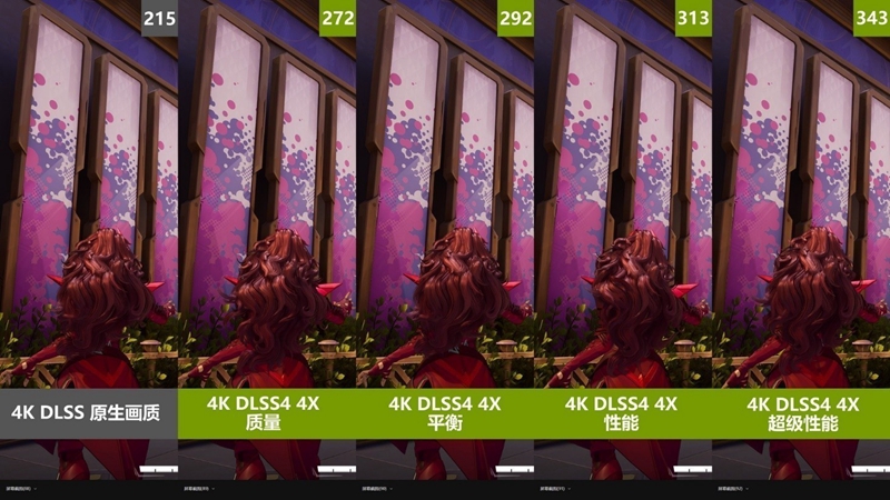在画面对比中,DLSS 4 4X的四档画质也很难看出区别,角色的头发、衣服,远处的建筑涂绘,基本都和原生画质分毫不差。从目前两款支持DLSS 4游戏的测试中可以明显看出,DLSS 4确实有着质的飞跃,在帧数大幅提升的同时,画质相比DLSS 3也更好。