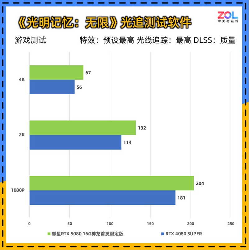 《光明记忆:无限》的光追测试软件是独立于游戏的测试工具,比游戏中用到的光线追踪技术更多,虽然游戏较老,但对于性能要求却非常高,本次测试条件为“RTX最高/DLSS质量”。性能方面,微星 RTX5080 16G神龙首发限定版相比RTX 4080 SUPER的提升分别为:1080p提升12%;2K提升15%;4K提升19%,综合提升16%。