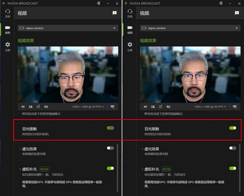 NVIDIA Broadcast一些经典效果更方便开启,其中目光接触功能非常适合远程会议,当我们开会盯着屏幕时,给人的感觉总是低头操作,而打开目光接触,无论你盯着屏幕哪里,AI总会将目光锁定到摄像头的位置,让人感觉你时刻都在注视着与会人员,并且还有一定“大眼”效果。这些功能都会运行在微星 RTX5080 16G神龙首发限定版显卡上,识别更加准确,跟随迅速。