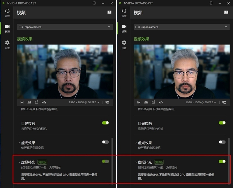 新版NVIDIA Broadcast界面更小巧,纵向布局也更方便视频直播中调节选项。