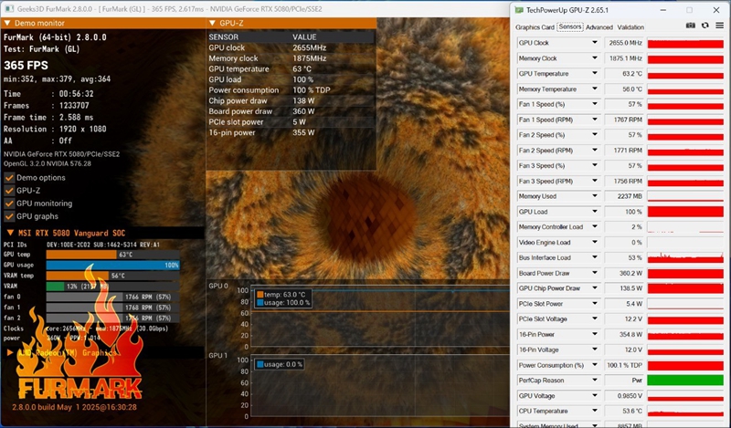 我们主要看橙色的温度信息,在连续满载30分钟之后,微星 RTX5080 16G神龙首发限定版的GPU温度为63℃;显存温度为56℃。另外可以看到在TDP100%的满载情况下,整卡功耗为360W。