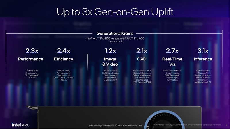 在更加细致的生产力相关图形性能方面以及推理性能方面,相比前代锐炫Pro A50以及NVIDIA RTX A1000来说,锐炫Pro B50代际提升幅度最高分别达到3.4倍和3.5倍。