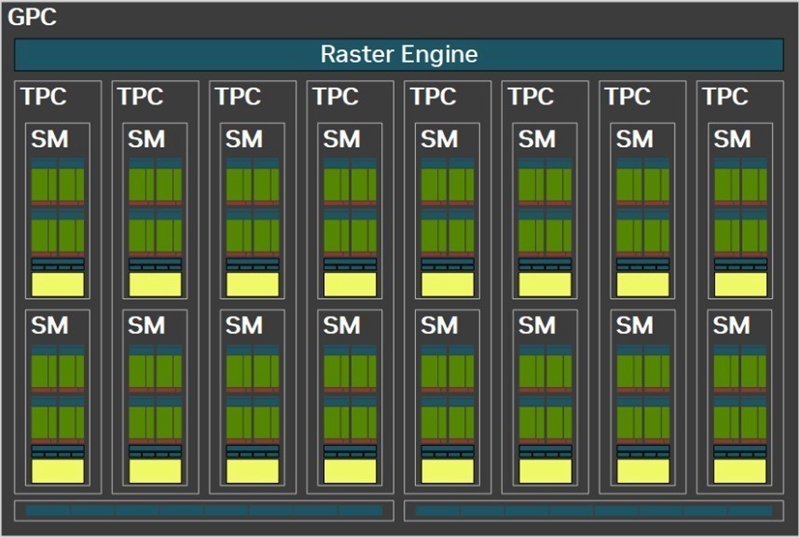 每个GPC包含一个专用的光栅引擎,两个ROP分区。每个分区包含8个单独的ROP单元和8个TPC,每个TPC包含1个变形引擎和两个SM单元。