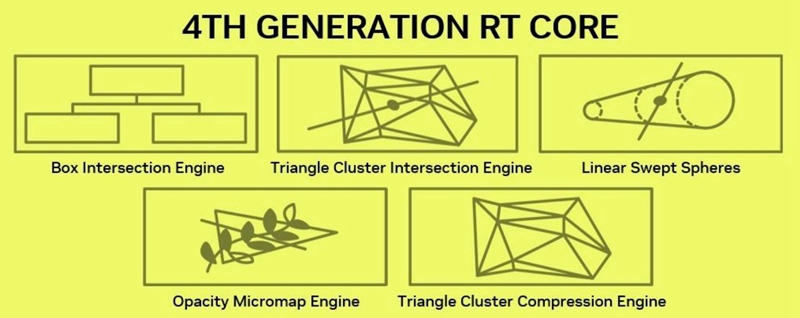 在第4代RT Core中,简单来说它相比Ada架构,在渲染光线追踪场景时,提供了两倍光线三角形相交测试吞吐量,并引入了Mega Geometry的结构算法。