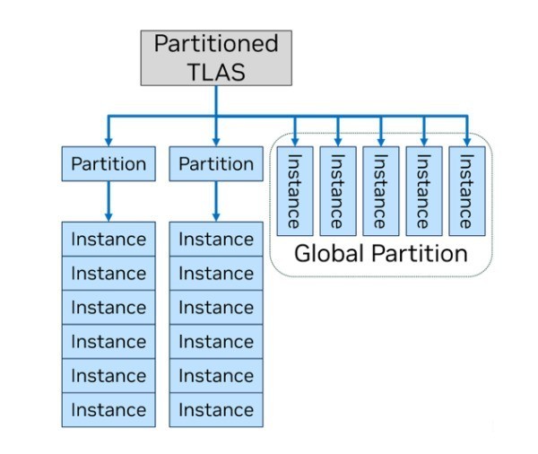 例如,游戏可以将静态游戏世界的各个部分放入所属的分区中,同时将动态对象分离到每帧重建的“全局分区”中。与传统的TLAS相比,请求的分区更新越少,节省的运行时开销就越大。