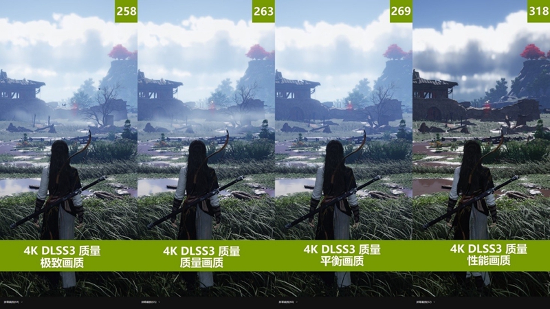 在画面对比中,我们固定4K分辨率、DLSS 3质量挡位,来看看游戏中不同画质下的差距。其中质量与极致的差别在于远景处石头的外观细节缺失,但近景并无影响。平衡与质量画质的差别则在于远景处体积雾的消失,同时远处房顶上的植被消失。