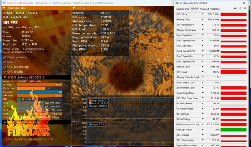 在出色的散热架构支持下,映众 RTX5090 D 曜夜 X3 32GB显卡在40分钟左右的烤机测试中GPU温度为75℃;显存温度为78℃。另外可以看到在TDP 100%的满载情况下,整卡功耗为577W。