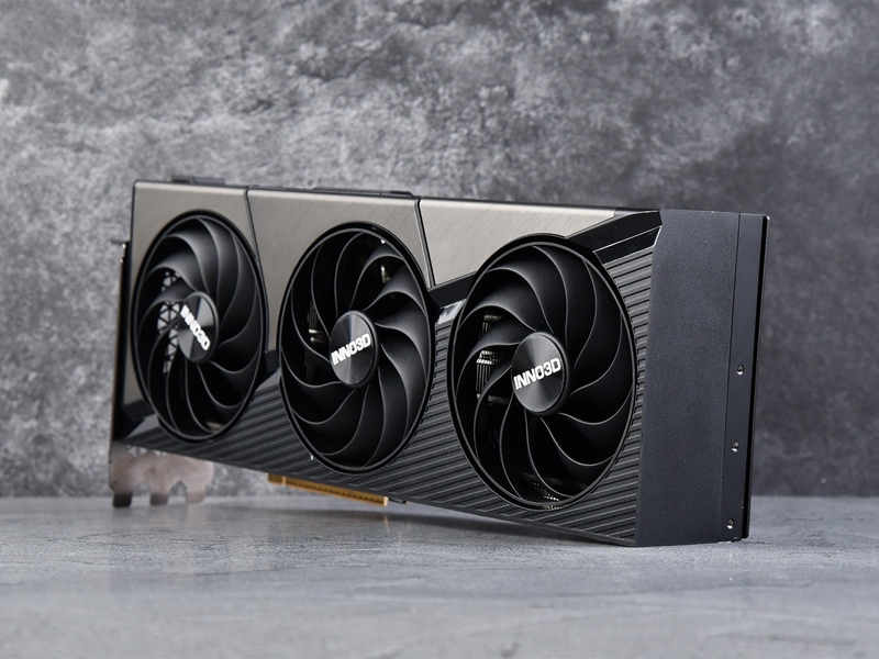 卡体顶部左侧的INN03D logo配有白色背光,16pin供电口位于中间偏右侧一点的位置,再右侧的金属拉丝面板上也印有“GEFORCE RTX”字样。