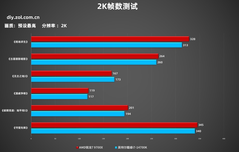 首先我们看一下2K分辨率,在2K分辨率中,AMD锐龙7 9700X在5款游戏帧数中都占据了帧数优势,包括《漫威争锋》和《守望先锋2》,《无主之地3》则是英特尔酷睿i7-14700K比较厉害。但很明显AMD锐龙7 9700X无疑是优势更大的一方。