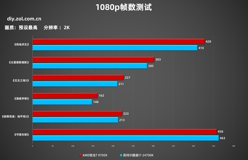 1080p帧数趋势与2K相近,AMD锐龙7 9700X依旧有5款游戏都有更好的帧数表现,虽然英特尔酷睿i7-14700K在《守望先锋2》帧数翻炒,但AMD锐龙7 9700X也夺回了《无主之地3》的帧数优势。