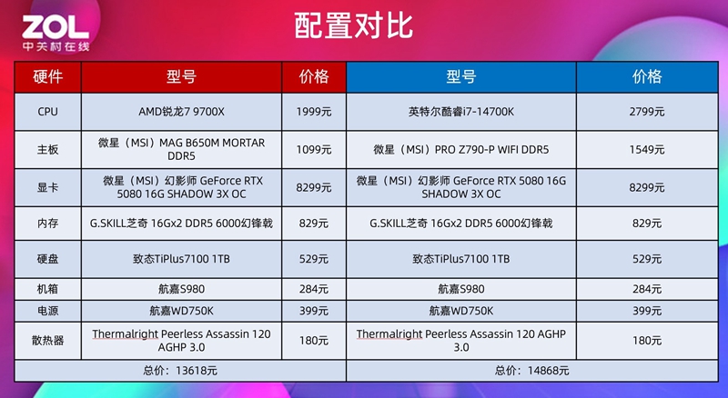 我们最后也做一个AMD锐龙79700X和酷睿i7-14700K的攒机单推荐,给大家清晰的展示双方平台的攒机价格差异。