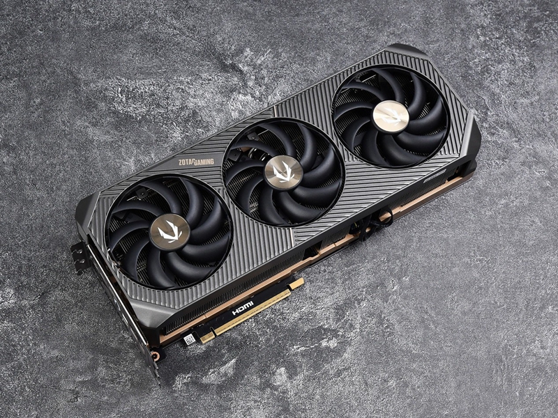 顶部是散热模组的出风口,整流罩左侧是金底白字的GEFORCE RTX字样,右侧是ZOTAC GAMING ARGB灯光模组,提供充满活力的1600万色彩及多种动态光效,即刻点亮心中热爱。除此之外,还能看到彩金色高强度合金压铸成型的中框,具有超强的抗扭、抗压能力,防止显卡变形,提升显卡整体结构强度。