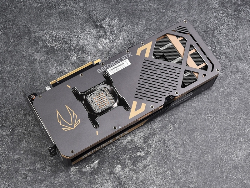背部配备高强度合金材料铸形而成的金属背板,增加显卡结构强度并能辅助散热,提升静电防护能力。侧面的大面积不规则镂空设计,便于显卡内部热空气快速排出,进一步提升散热效率。GPU固定支架框架应力分散设计,优化VC均热板与GPU的压力分布和紧密度,让VC均热板导热更均匀高效。