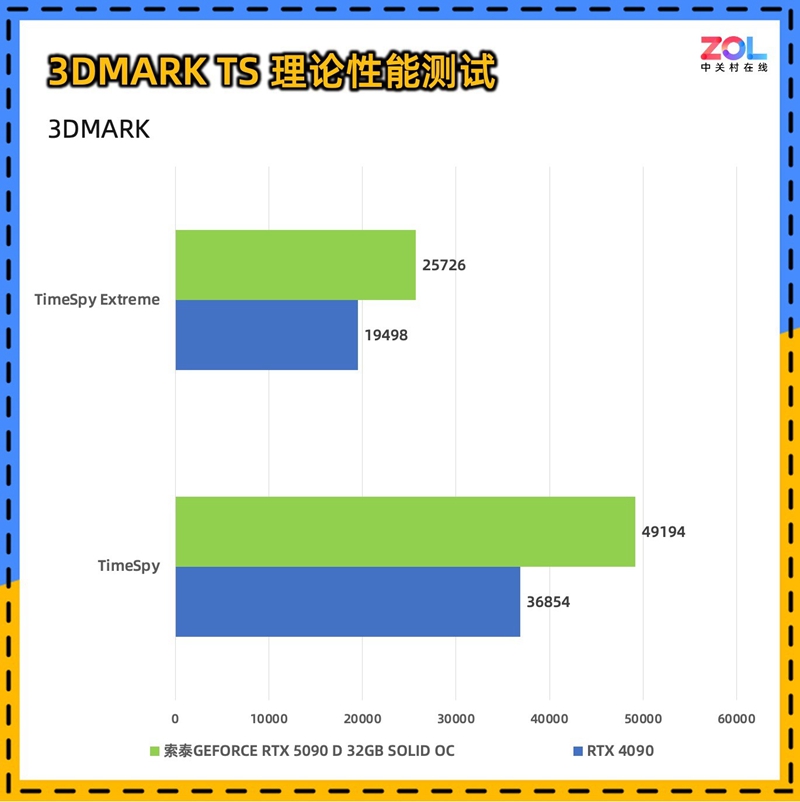 在针对DX12环境下的TimeSpy和TimeSpy Extreme测试中,索泰GEFORCE RTX 5090 D 32GB SOLID OC相较于RTX 4090,TS提升33%,TSE提升32%,综合提升约为33%。