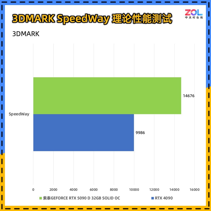 再来看看3DMARK中新增的具体应用场景的测试。SpeedWay结合了实时光线追踪和传统渲染技术,场景含有光线追踪反射、实时全局光照、网格着色器、体积照明、粒子和后处理效果,因此该项测试基本可以看做次世代3A游戏基准。经测试,索泰GEFORCE RTX 5090 D 32GB SOLID OC相对于RTX 4090提升了50%。