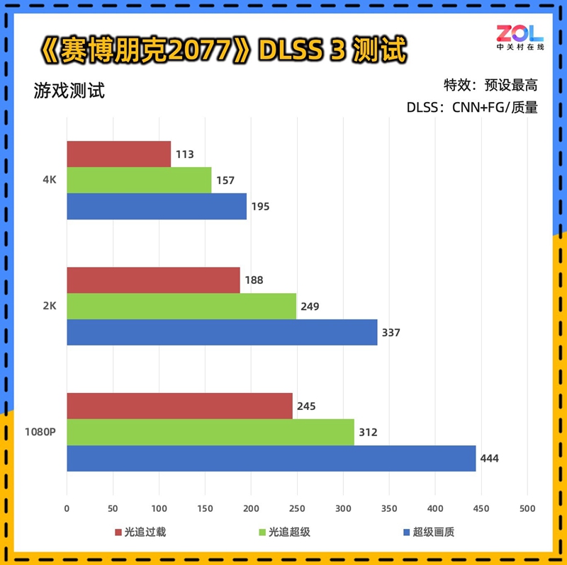 在4K分辨率下的DLSS3帧生成模式中,相比DLSS2在质量模式中提升了35%,达到222帧高能电竞级帧率。