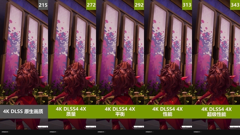 至于游戏的画面对比,DLSS4 4X的四档画质也很难看出区别,例如角色的头发、衣服,远处的建筑涂绘,基本都和原生画质分毫不差,帧数和细节兼顾。可见DLSS4在帧数大幅提升的同时,画质相比DLSS3也更好,可以说再次领先了一个时代。