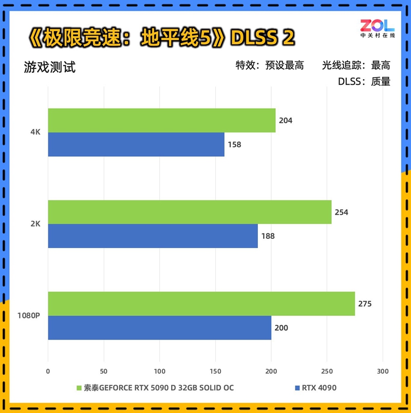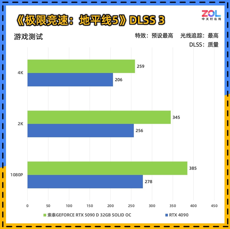第二款游戏《极限竞速:地平线5》也是显卡测试的常客,其出色的优化在原生效果下即可跑出优秀的成绩。在4K分辨率下,索泰GEFORCE RTX 5090 D 32GB SOLID OC的DLSS3成绩再创新高,达到了259帧,让玩家真正感受风驰电掣的感觉。