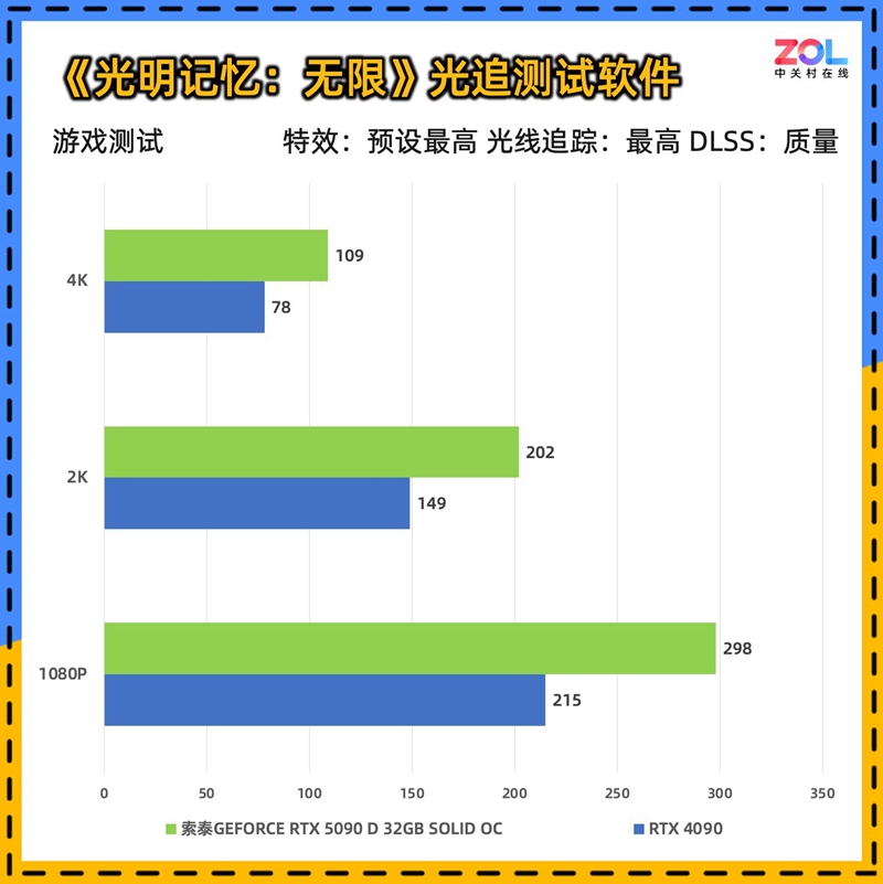 第五个是《光明记忆:无限》的光追测试软件,性能要求非常高,比游戏中用到的光线追踪技术更多。本次测试条件为“RTX最高/DLSS质量”,索泰GEFORCE RTX 5090 D 32GB SOLID OC相比RTX 4090,1080p分辨率提升39%,2K分辨率提升36%,4K提升40%,综合提升38%。