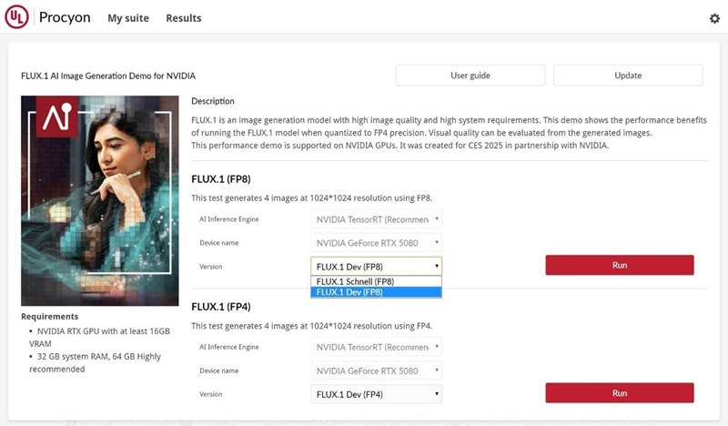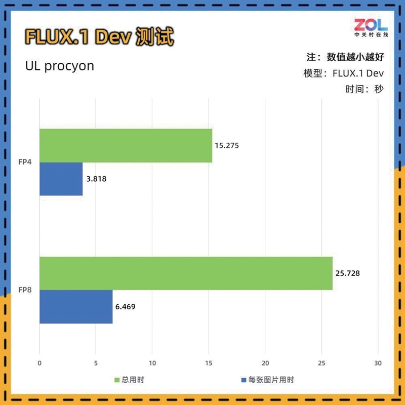 本次测试UL提供了FLUX.1Dev绘画模型的FP4测试,该模型在FP16上运行需要超过23GB的显存,这往往需要每代的90级旗舰显卡或者专业显卡。而FP4只需要不到一半的显存即可运行,这使得更多80级和70级的显卡均能在本地运行,而且使用NVIDIATensor RT提供的量化方法,几乎没有质量损失。
