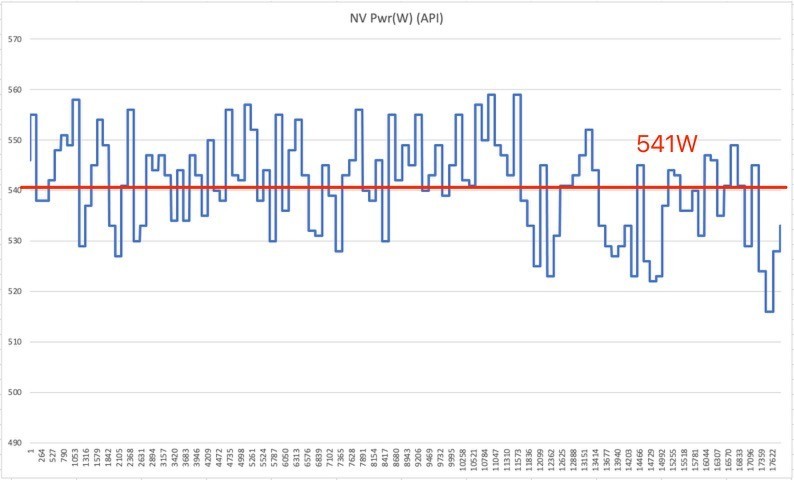 除了满载烤机,我们还测试了游戏中显卡的真实功耗数据,在《赛博朋克2077》benchmark设置4K分辨率的光追加速画质,并开启DLSS4 4X多帧生成,将显卡性能拉满。经测试,索泰GEFORCE RTX 5090 D 32GB SOLID OC的平均功耗为541W,相比FurMark烤机低34W左右,功率释放还是非常显著的。
