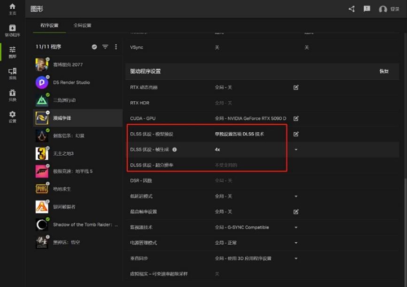 从APP中强制开启DLSS4的功能,在RTX 5090 D首测时候的《漫威争锋》游戏中已有介绍(现在已经全面支持DLSS4),虽然给游戏带来的加成是狂暴级别,但目前并不是所有游戏和软件均支持此功能。