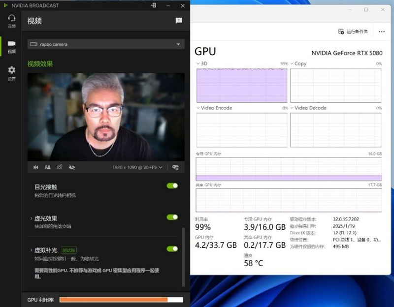 新版的NVIDIA Broadcast还增加了GPU利用率的显示,当软件中功能全部打开时,对于GPU的占用率还是非常高的,比较适合会议等不需要过多GPU参与的场景。而如果是游戏直播,则可适当关闭AI效果,以降低GPU利用率。不过目前新版NVIDIA Broadcast仍处于测试阶段,实际效果与GPU开销应以正式版为准。