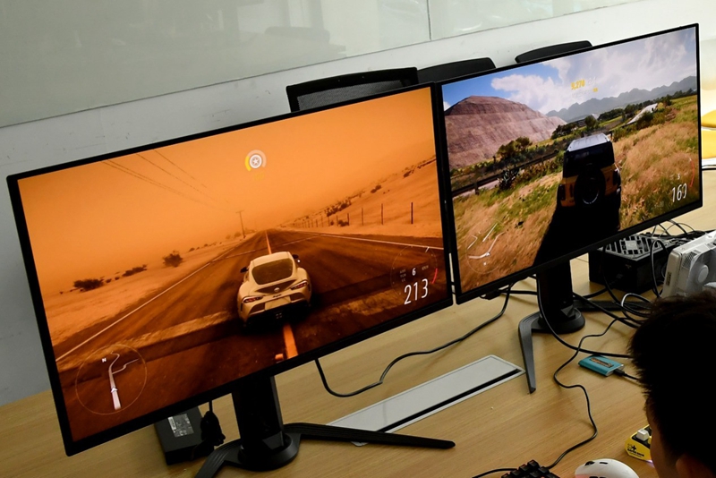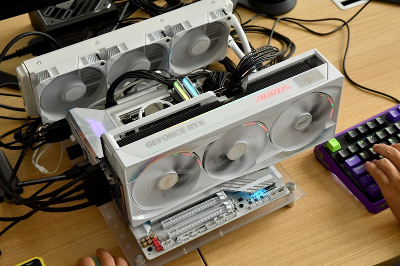 技嘉AORUS RTX 5090 D MASTER ICE显卡拥有3个DP 2.1b接口以及一个HDMI2.1b接口,原生支持4台显示器,这里我们搭配了2台技嘉FO32U2P OLED显示器以及2台技嘉FO27Q3 OLED显示器,这两款显示器采用QD-OLED面板,经过ClearMR 13000认证以及HDR400认证,提供了更加真实的画面表现。